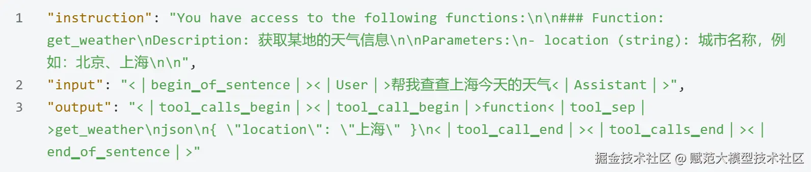 那模型是如何具备Function calling能力的呢?答案是通过模型训练。对于Qwen3模型来说,由于在训练阶段(指令微调阶段)就带入了大量的类似如下的工具调用对话数据进行训练,因此能够识别外部工具并发起对外部工具调用的请求。而类似的,R1模型的训练过程没有工具调用数据,因此就不具备Function calling能力。
