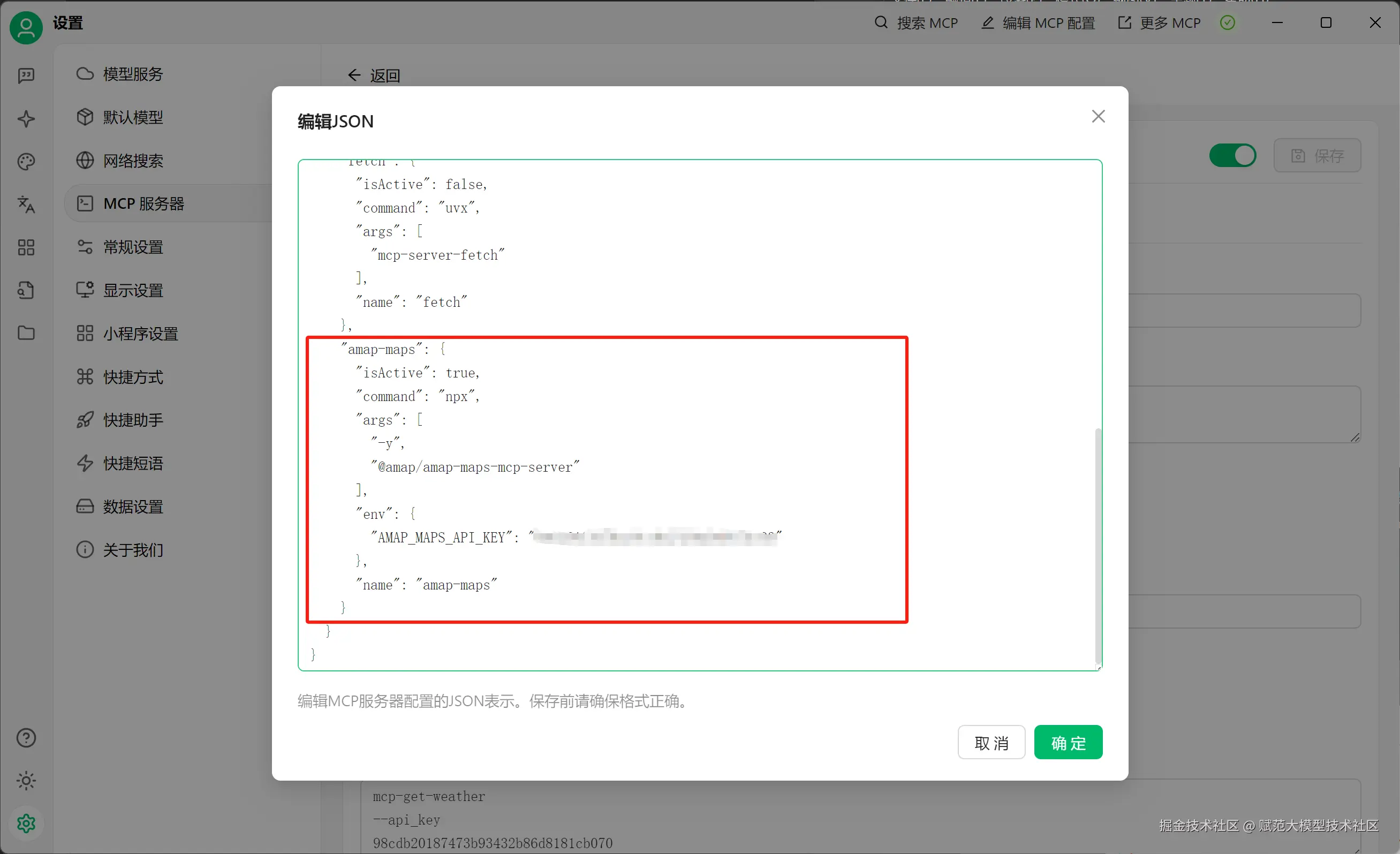 而在MCP技术大爆发的今天,接入一个MCP工具也是非常简单,以下是一个将高德地图导航MCP(服务器)接入Cherry Studio(客户端)的示例: