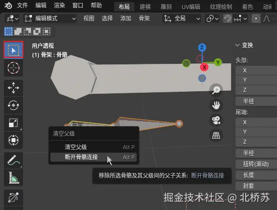 我这里要做的是第一个骨骼是根骨骼,而他下面的子骨骼要放到模型的内部去。所以就需要和根骨骼进行断开,然后移动子骨骼到指定位置。
