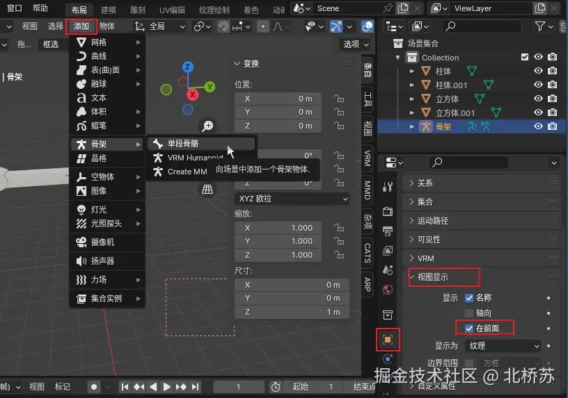 点击添加 -> 骨架 -> 单段骨骼,一开始他会被模型挡住,这时候找到属性的 “物体” -> 视图显示,勾选 “在前面”,还可以把名称显示出来。