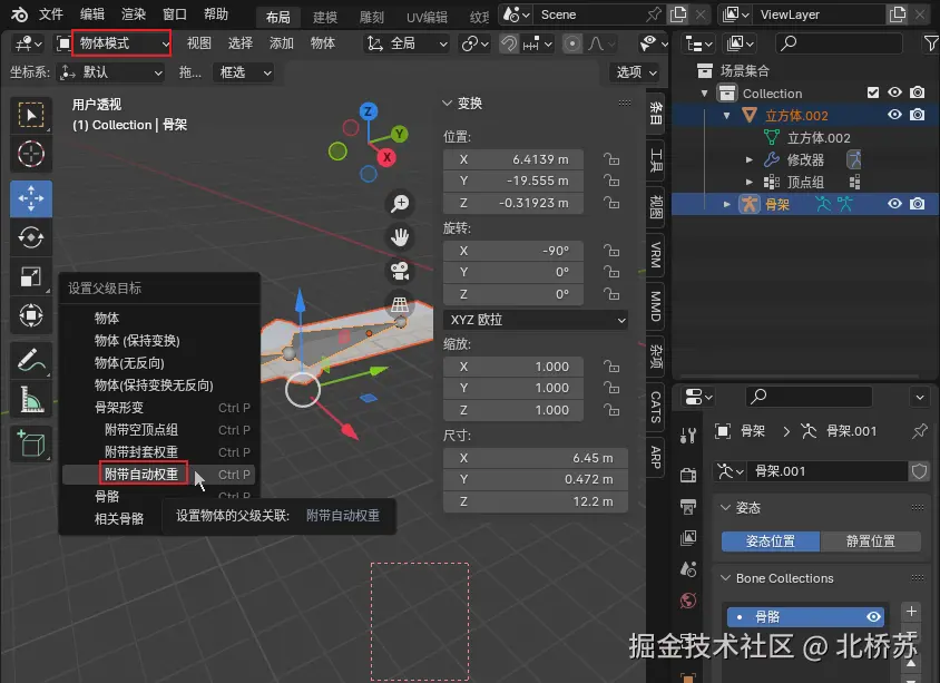 切换到物体模式,Shift 选中所有的模型和骨骼 (一定要最后选骨骼),快捷键 “Ctrl+P”,然后选择 “附带自动权重”。