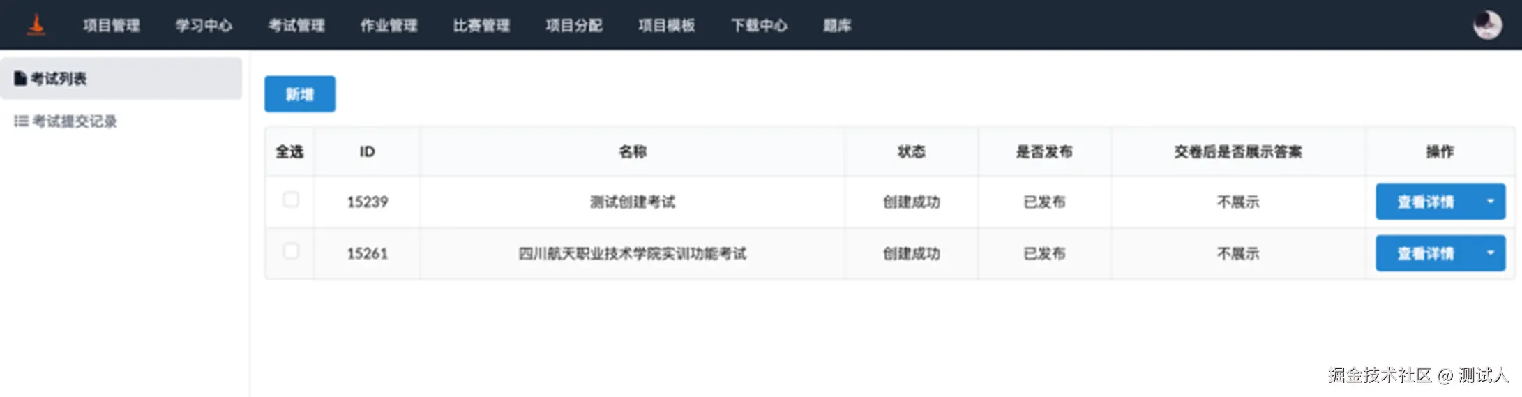 (11)考试管理:包含考试列表、考试提交记录、考试成绩记录。学生可查看老师发布的考试任务,并进行作答、提交,教师开放权限后,学生可查看自己的作答情况、参考答案和成绩。