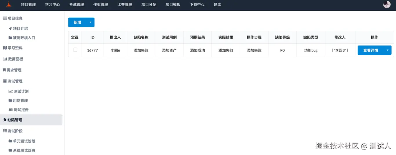 5、测试报告:学生可以创建、编辑、提交测试报告,教师可以查看学生的测试报告。