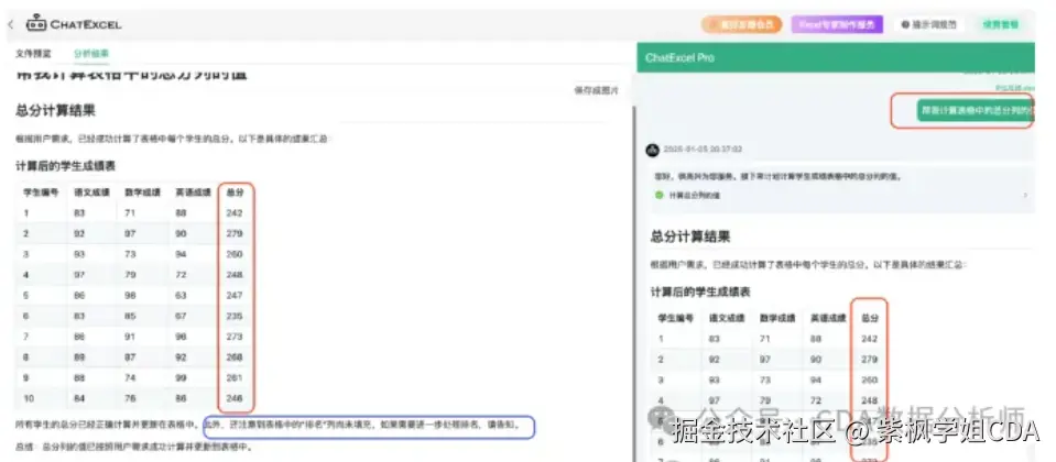 可以看到,AI分分钟就帮我们把表格的总分列计算出来了。