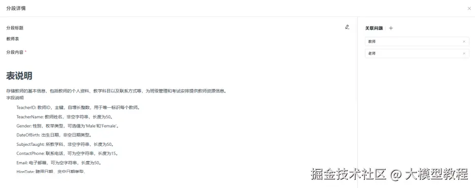 为了提高后续检索的相似度,建议同时为每一张表创建问题,问题主要为此表的名称(此操作的意义为:比如用户提问“7年级一共有多少老师”,知识库中能够准确的匹配出班级表和教师表两张表)。问题需要尽量地覆盖用户对不同对象的称呼,比如教师又可以称为老师,具体如下图所示。