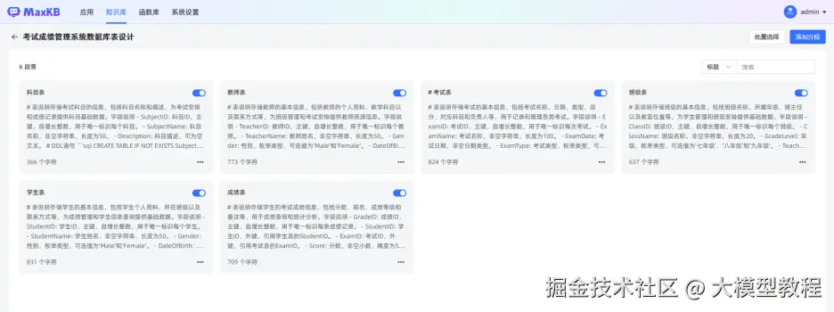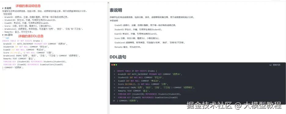 提前准备“学生考试成绩管理系统”数据表详细的DDL信息,需要确保所有数据表的DDL信息完整且准确,包括字段类型、约束条件等。DDL信息后续需要导入到MaxKB知识库中,如果当前数据表不具备或者不清晰,具体的可以参考下图进行完整性补充。