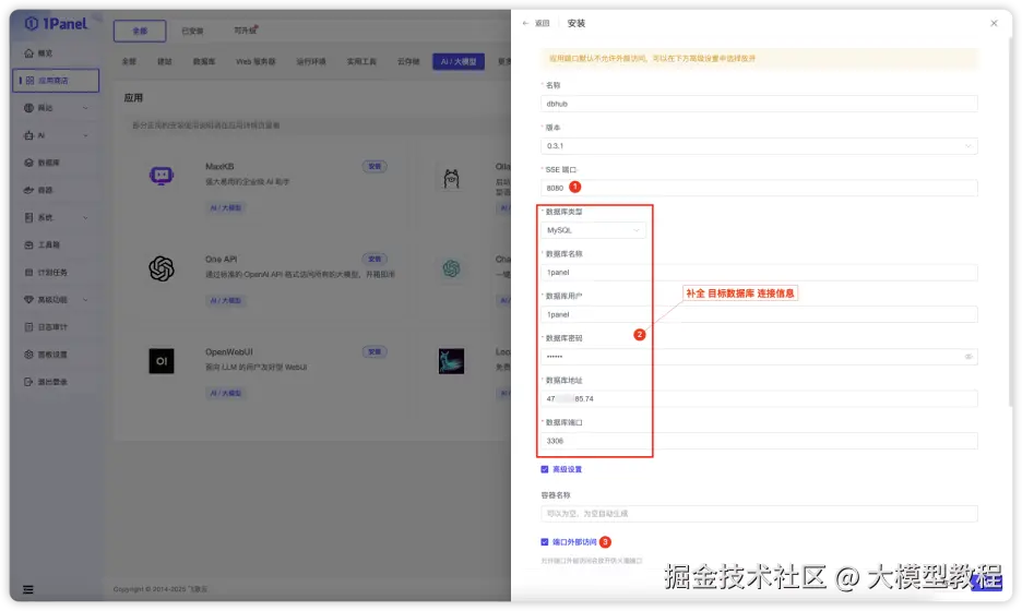 DBHub的部署方式也很简单:进入1Panel应用商店,在“AI/大模型”分类下找到DBHub应用,点击安装即可(注意:需确保1Panel服务器已放行SSE端口)。