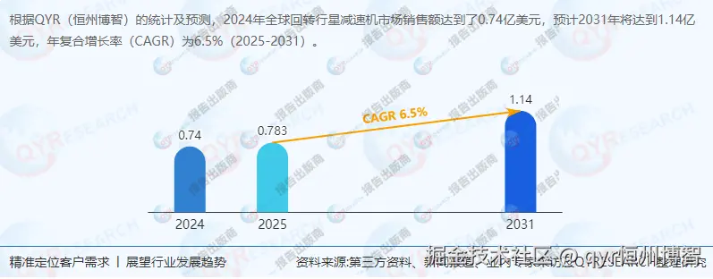 总体规模:根据QYResearch最新调研报告显示,2024年全球回转行星减速机销售额达0.74亿美元,预计2031年增至1.14亿美元,2025-2031年CAGR为6.5%,增速高于传统减速机市场(约4%-5%)。