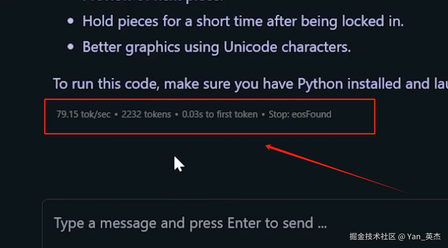 我们先试用一下 DeepSeek-R1-Distill-Llama-8B 模型。向他提出一个简单的问题:生成一个俄罗斯方块的代码。之后模型就会以一个非常快的速度生成文本,可以看到模型速度高达79 token/sec。