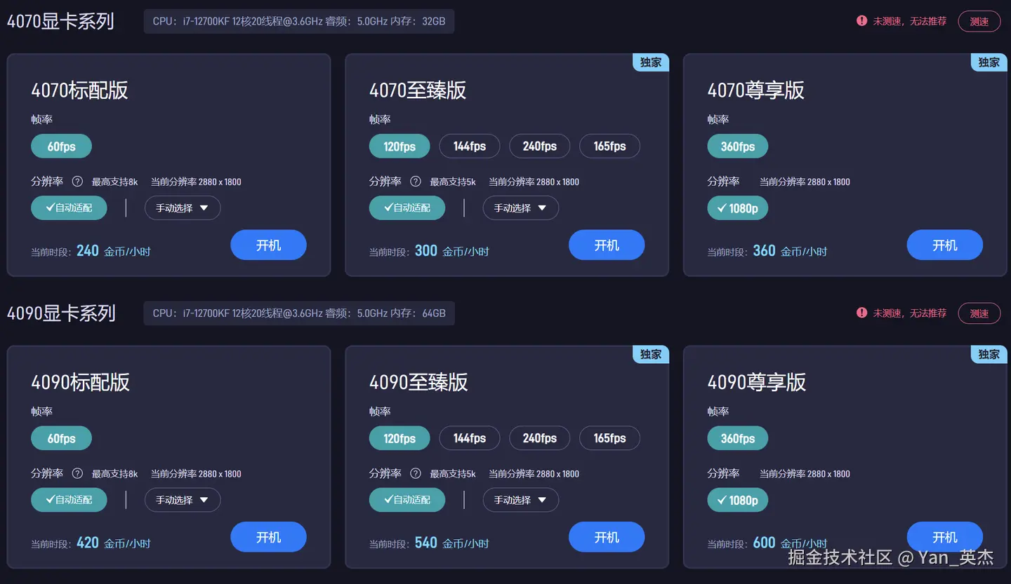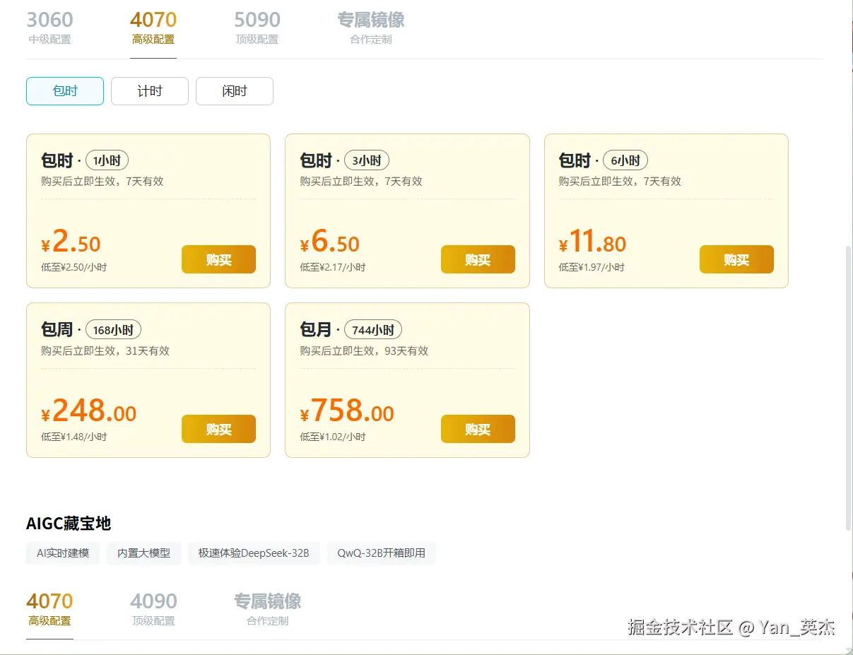 ToDesk云电脑提供了3060、4070、4090、5090四种配置,是三家中唯一开放5090的厂商。本次我们就选购4070、5090套餐。