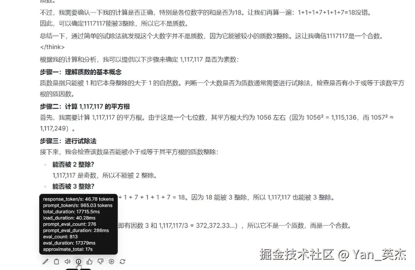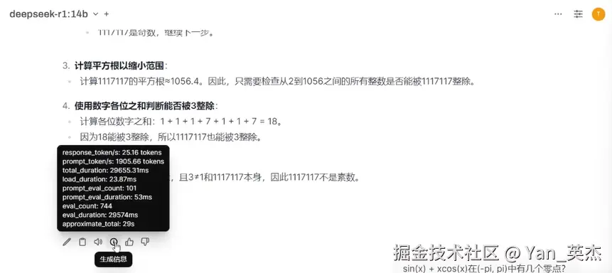 接下来我们试一下14B模型,这个模型性能相比7B有巨量的提升,不过速度就比较堪忧了。生成速度仅有25 tok/sec,答题全过程花费了半分钟,有点慢了