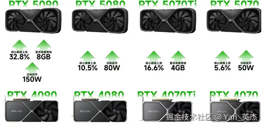 从2025年CES大会英伟达发布RTX50系显卡以来,5090、5080和5070/Ti已经陆续推出。相比上一代的40系显卡,由于更换了显卡架构与核心制程,50系显卡在CUDA核心数、带宽、核心频率以及显存容量上都有大幅提升。再加上DLSS 4加持,在稳定帧数、锯齿处理和光线重构上绝对是目前最顶级的体验。