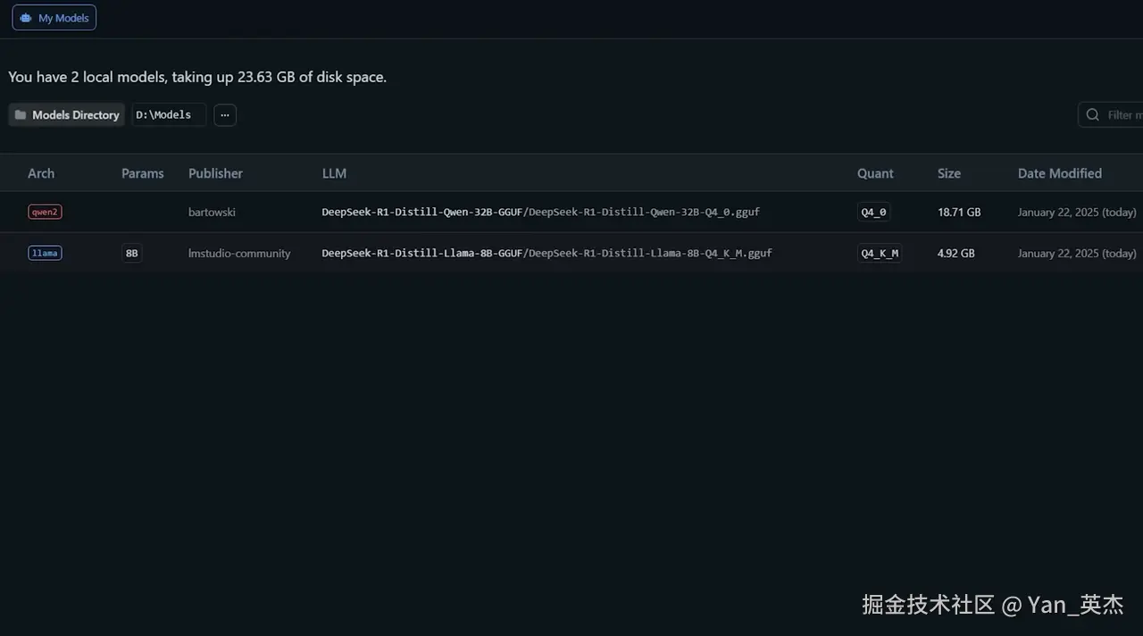 我们利用部署工具包在LM Studio中部署 DeepSeek-R1-Distill-Llama-8B 和 DeepSeek-R1-Disti11-Qwen-32B 模型。前者占用将近5g空间,而后者占用了恐怖的18g空间。得益于5090的32g超大显存,这一切都不会成为我们体验LLM模型的阻碍。