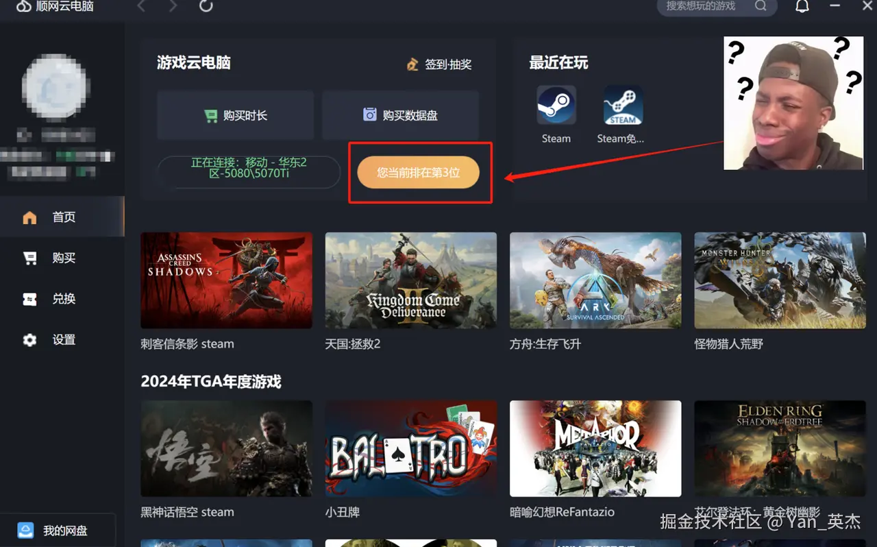 顺网云的套餐模式不太相同,它是通过进入不同分区选取显卡,以40系为主,50系有5070ti/5080分区一个,不过一直要排队。