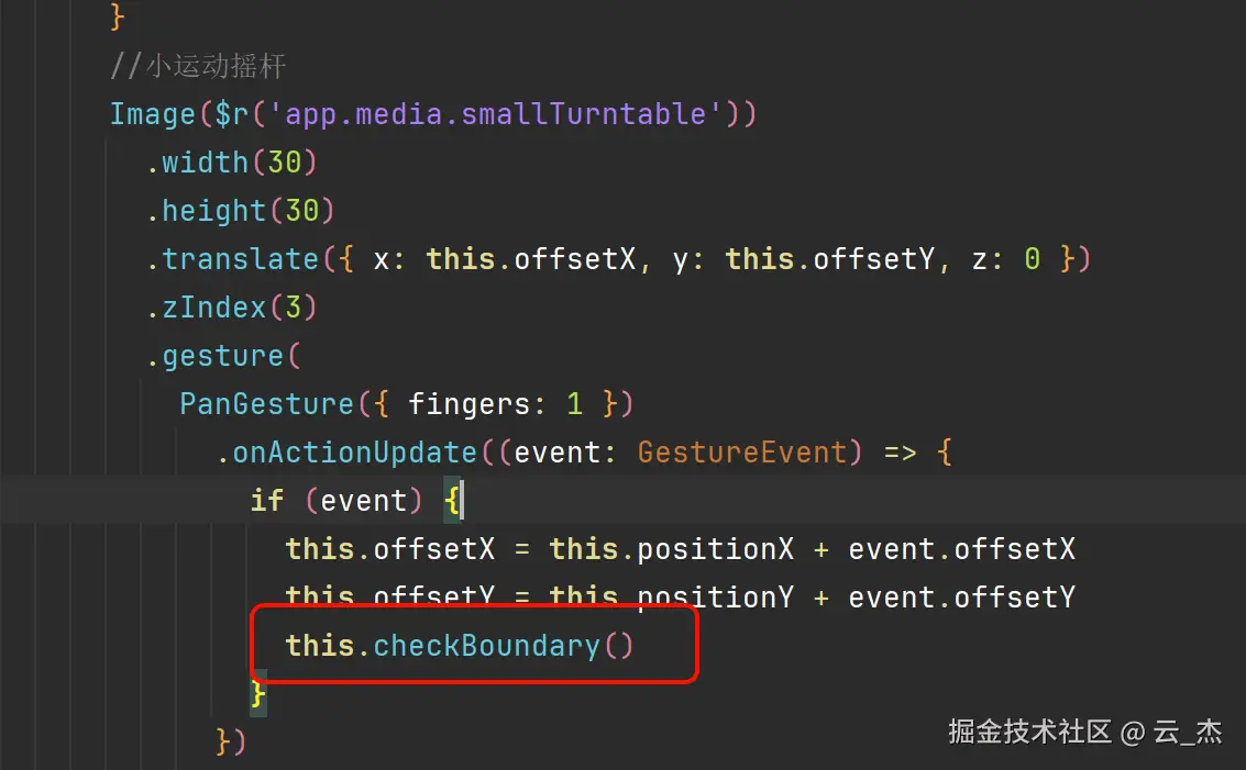 //小运动摇杆 Image($r('app.media.smallTurntable')) .width(30) .height(30) .translate({ x: this.offsetX, y: this.offsetY, z: 0 }) .zIndex(3) .gesture( PanGesture({ fingers: 1 }) .onActionUpdate((event: GestureEvent) => { if (event) { this.offsetX = this.positionX + event.offsetX this.offsetY = this.positionY + event.offsetY } }) .onActionEnd((event) => { this.offsetX = 0 this.offsetY = 0 }) )