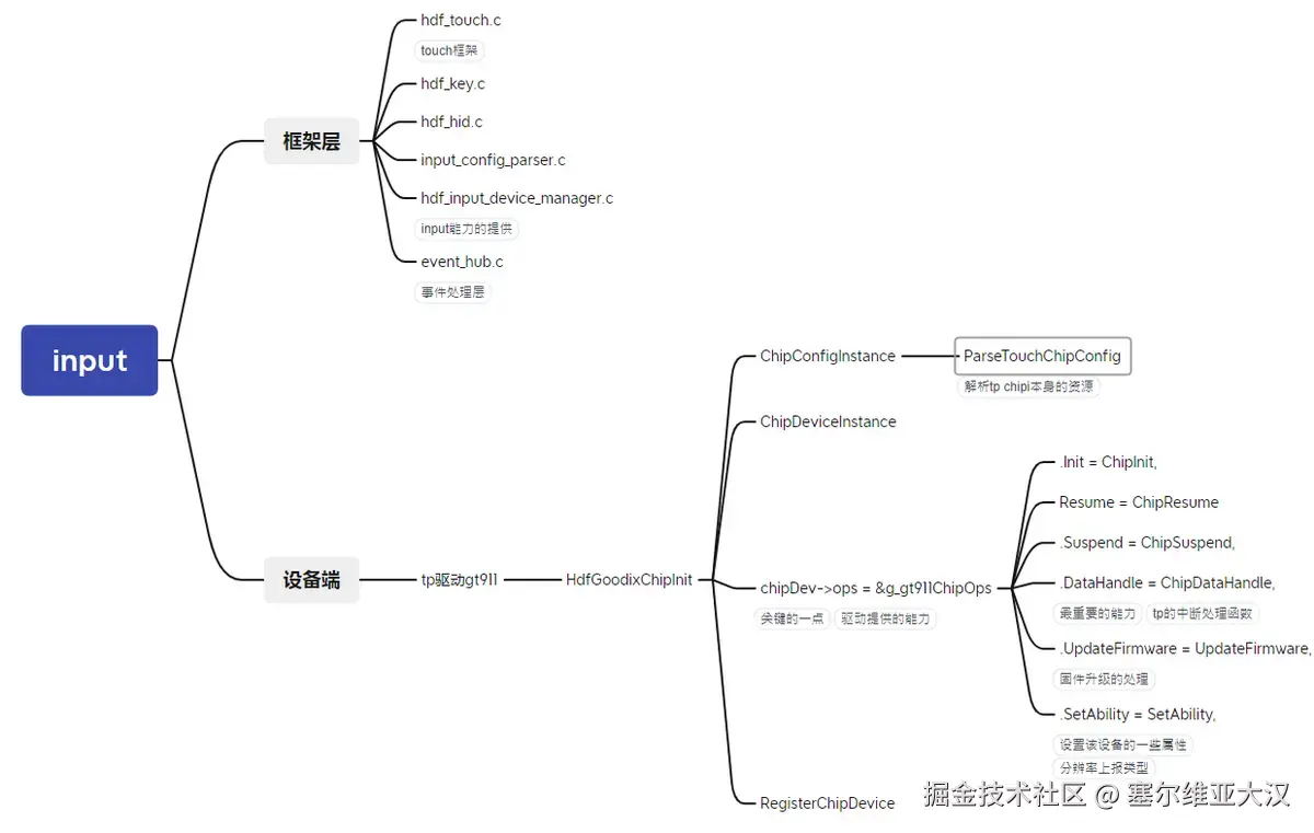 dayu200 平台默认支持 GT5688 这颗 TP IC。 开发板移植 touch 驱动涉及的文件及目录: 1、 Makefile 文件: drivers\adapter\khdf\linux\model\input\Makefile 2、 vendor\hihope\rk3568\hdf_config\khdf\device_info\device_info.hcs 3、 vendor\hihope\rk3568\hdf_config\khdf\input\input_config.hcs 4、 drivers\framework\model\input\driver\touchscreen TP 驱动的适配涉及 TP 驱动和 hcs 配置 tp 驱动的适配依赖 hdf 的 input 模型,hdf 的 input 模型提供了 TP,KEY,HID 等场景的设备注册,管理,数据转发层,hcs 解析等场景的支持能力。hdf 的 input 模型可大致抽象为驱动管理层、公共驱动层以及器件驱动三层。 从功能的角度看 hdf input 模块的框架如下: