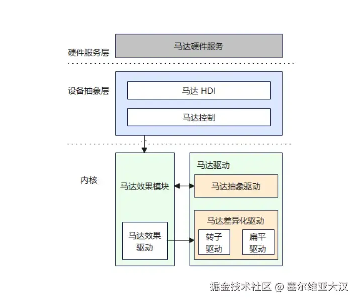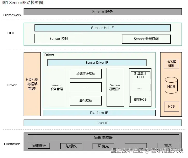 Vibrator 驱动模型主要包含 Vibrator(传感器)相关的 HDI 接口与实现,提供 Vibrator HDI(Hardware Driver Interface)能力接口,支持静态 HCS 配置的时间序列和动态配置持续时间两种振动效果。调用 StartOnce 接口动态配置持续振动时间;调用 StartEffect 接口启动静态配置的振动效果。 图 1 Vibrator 驱动模型图