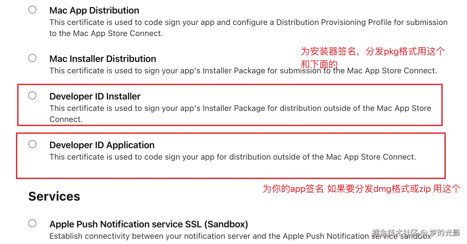 首先我们需要去苹果官方网站,申请一个开发者证书(需要每年99美元的年费),Developer ID Application ,如果你想要打包成pkg格式的安装包,需要再准备一个Developer ID Installer 证书。