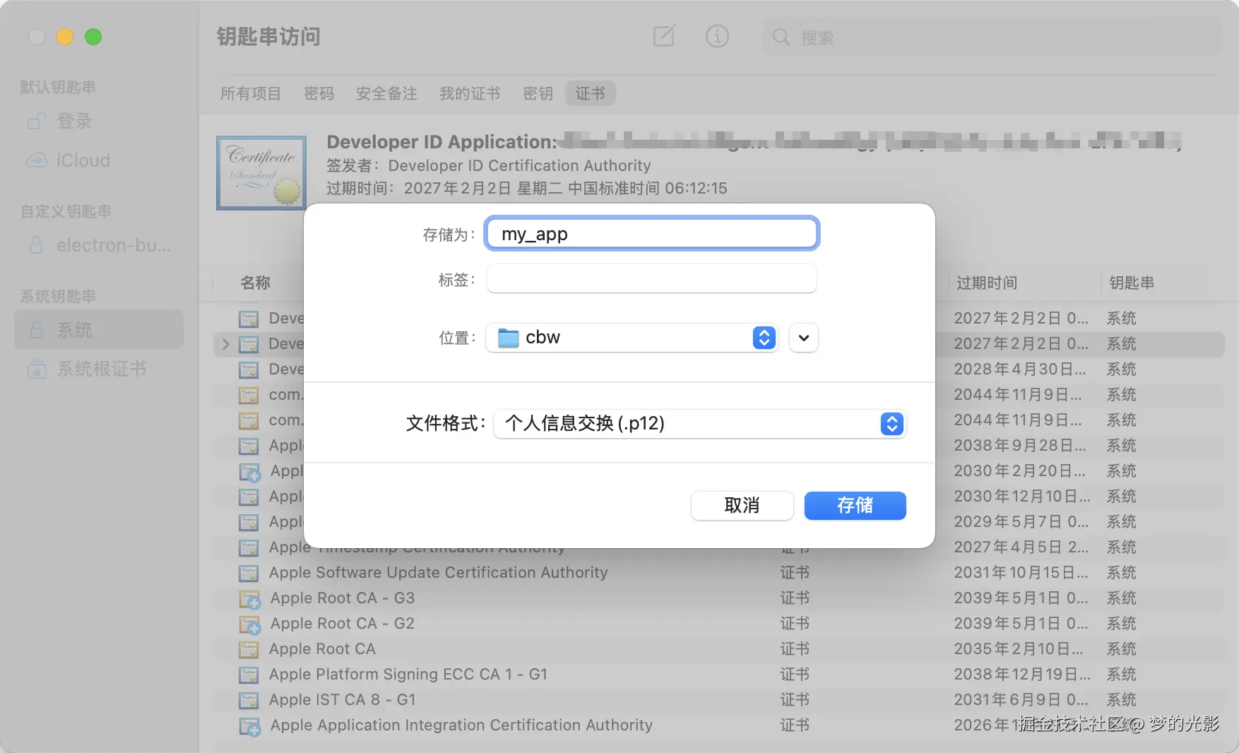2.所以说签名还是很简单的,那么问题来了,现在只有你的钥匙串里有证书,别人没有,想让你的队友也打包签名怎么办呢?答案很简单,只需要右击导出成p12,发给别人就行