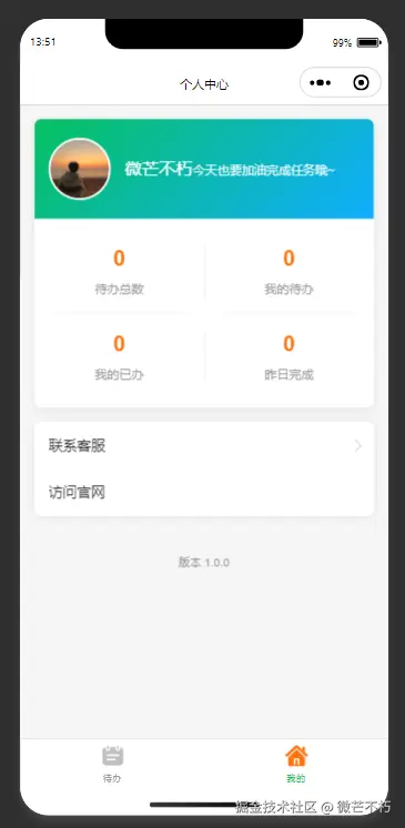 写一个微信待办小程序,需要获取用户的昵称和头像,并显示在用户中心页面,主页显示待办的增删改查,勾选即可完成该任务