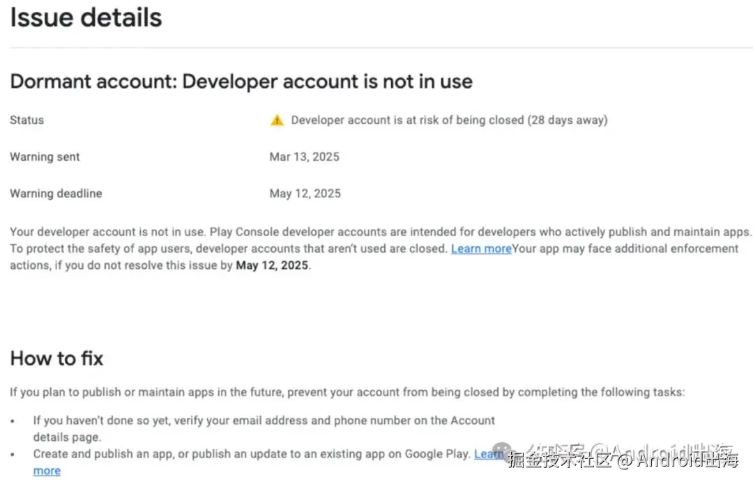 注意:在停用休眠账号前,Google Play会使用会开发者发送多次邮件通知。并且注册费不予退款,休眠账号被停用,开发者日后仍可创建新账号并在Google Play上发布内容。