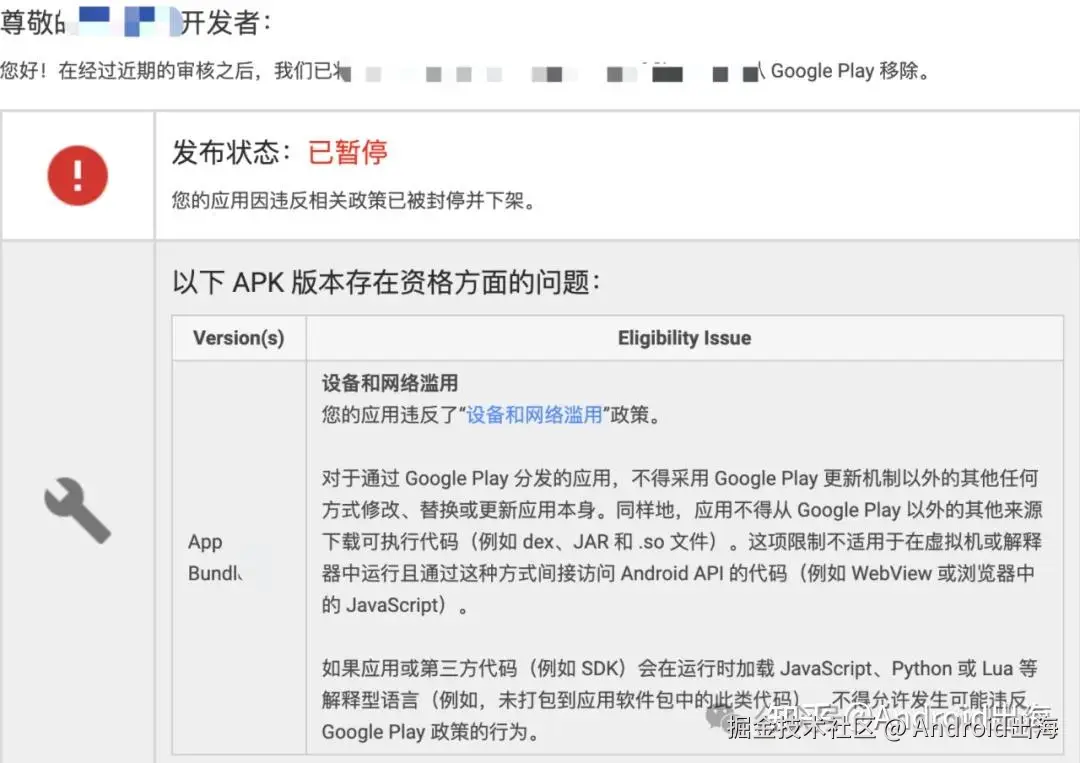 注意:暂停属于非常严重的违规,据Android出海观察,一般超过3次左右暂停,Google Play开发者账号被封概率极大。