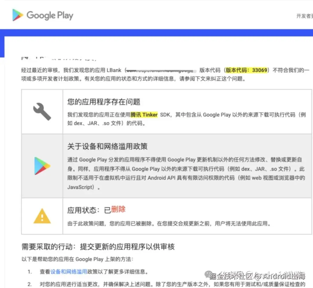 - 多次下架可能会导致Google Play开发者账号被中止。