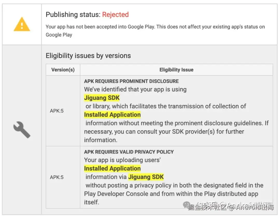 - 被拒不会影响开发者访问被拒绝应用的现有用户安装量、统计信息和评分。