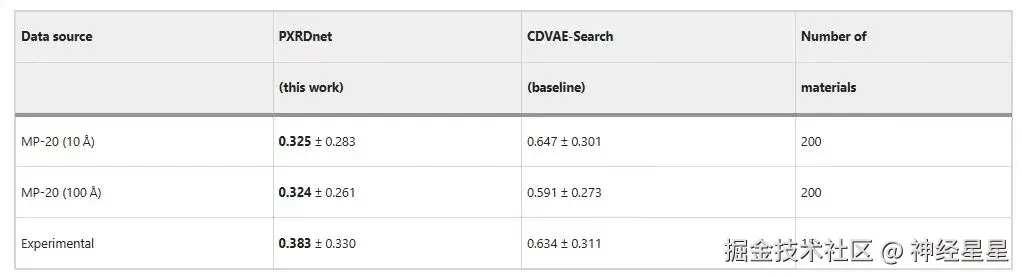 以下表格展示了 PXRDnet 能够成功重构 MP-20 中的材料,与 CDVAE-Search 基线相比,PXRDnet 的预测结果更加突出。