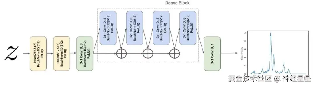 PXRD 回归器由 DenseNet 启发的架构进行参数化,该架构扩展了传统的卷积神经网络 。 回归器基于 CrystalNet 的设计,具有一维输入和输出的密集连接架构。具体来说,对于网络中的给定深度,DenseNet 将先前的中间数据表征聚合起来,作为下一个卷积层的输入。 如下图所示。