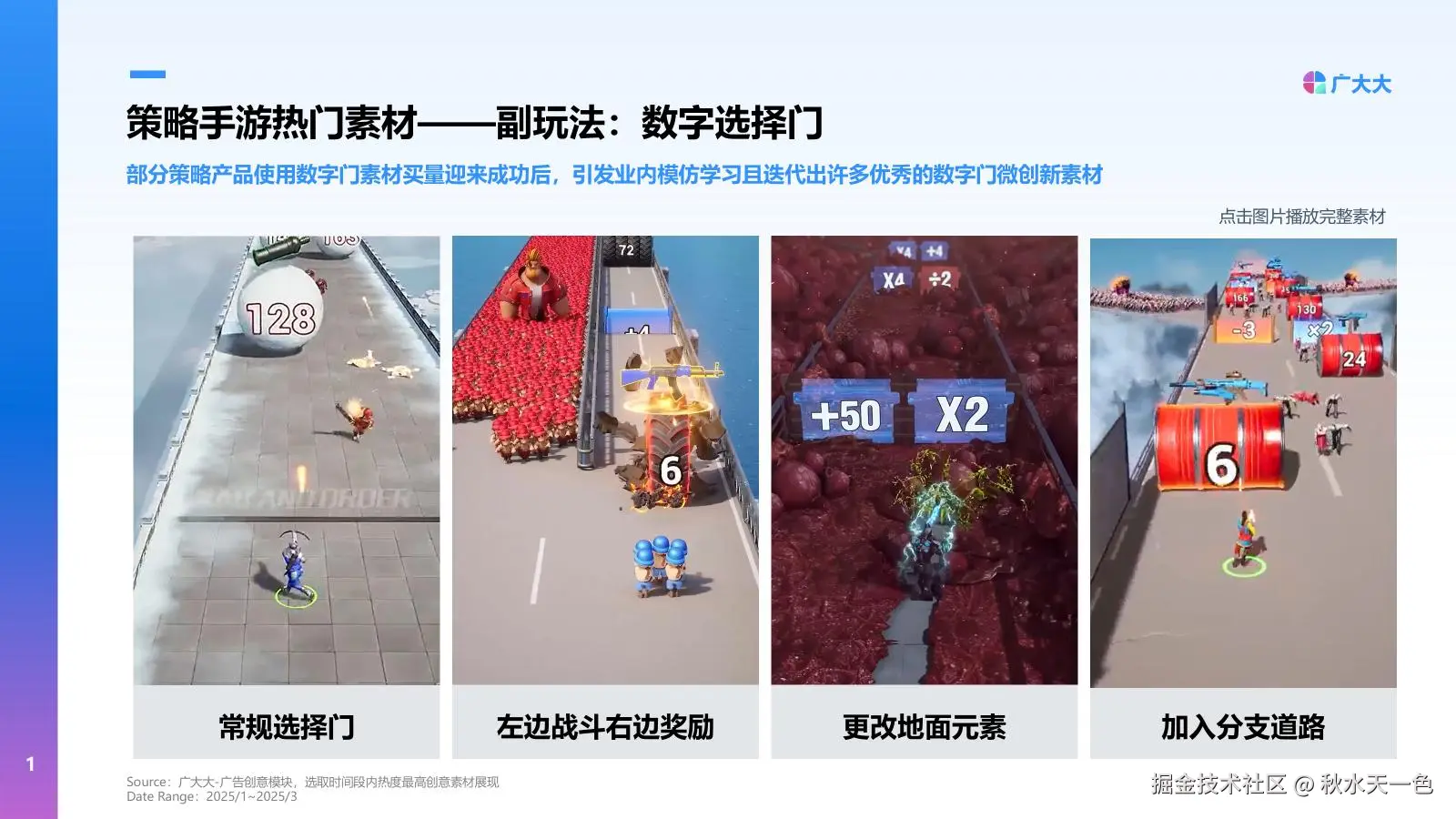 此外“数字选择门”副玩法也是2024年到2025年策略手游营销的关键词之一,部分策略产品使用数字门素材买量迎来成功后,引发业内模仿学习且迭代出许多优秀的数字门微创新素材。