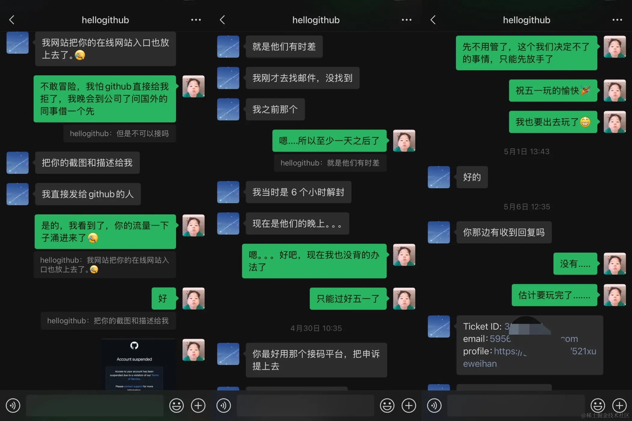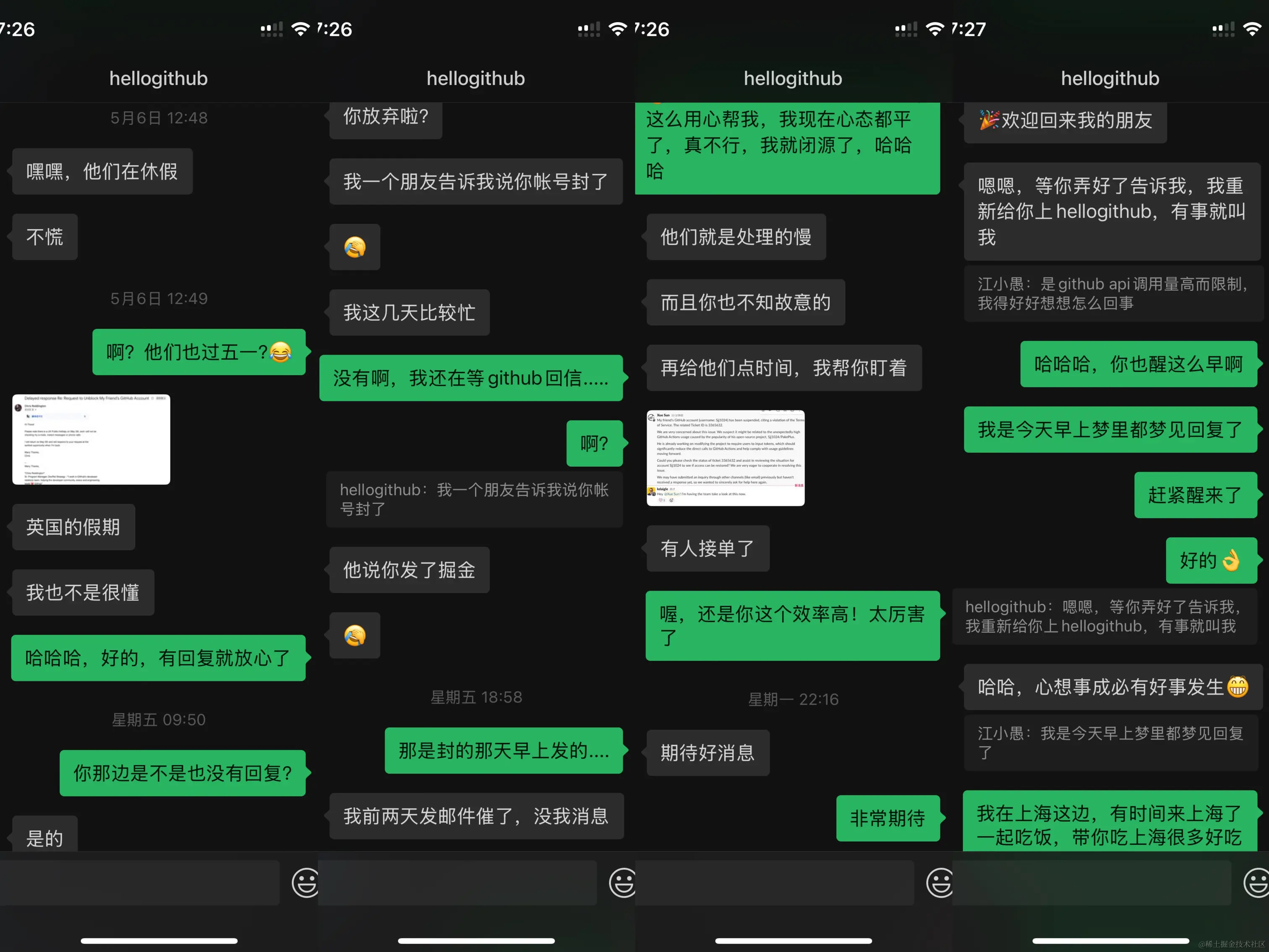 其实原本想着过了五一之后,就可以收到github的回复,然后对症下药了,结果五一后上班两天了,还没有动静,此时我已经注册了github小号,真不行就用小号苟且活着。但是好在hellogithub站长有专属催单通道,在5月12号晚上22点11催单,10分钟后就有回复说接单了,凌晨00:34终于收到了github谅解通知,我又回来了!哈哈哈