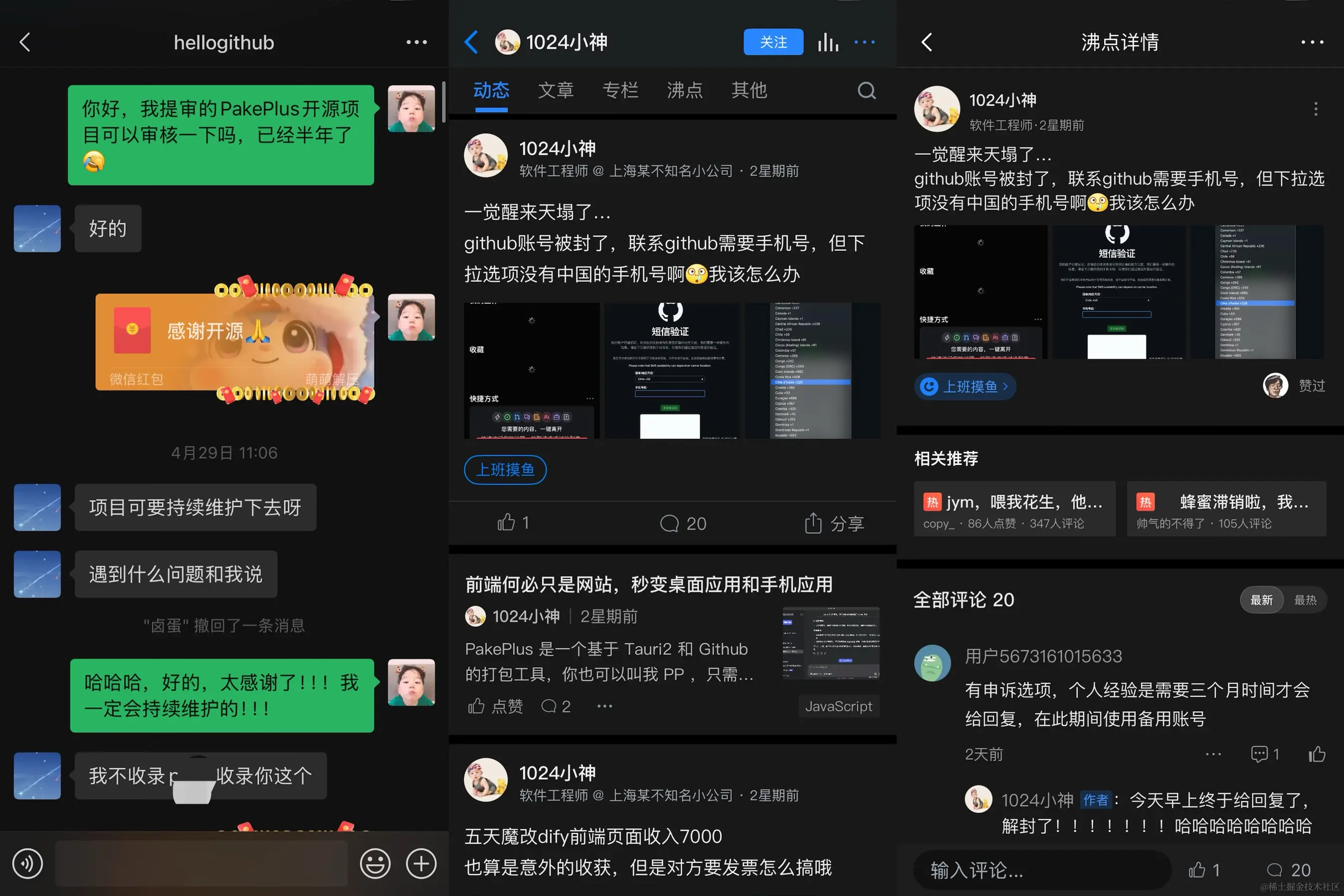 感恩我的hellogithub朋友,虽然我并不知道你的名字,也不知道你家住何方,更没有利益关系,但是我知道,没有你我就不会这么快被github解封,没有你,就不会带给PakePLus这么大的流量,没有你,我将缺少一个非常非常非常要好的朋友。再感谢我的同事常总,没有你,我将不会那么快通过github的手机验证,我的好朋友,有你们真好。