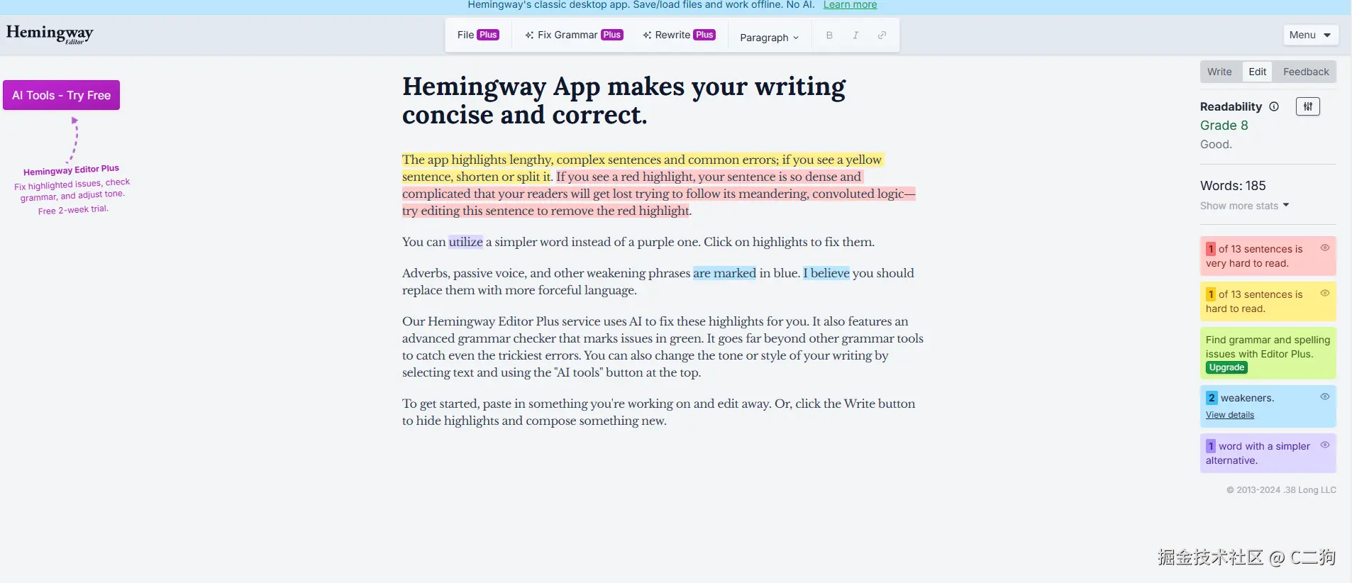 Hemingway Editor通过颜色标注复杂句和冗余词,帮助用户简化表达、提升可读性。黄色高亮显示过长句子,红色提示复杂结构,紫色建议替换更简洁的词汇。虽然不直接降重,但优化后的文本更贴近人类写作风格,可间接降低AIGC检测风险。