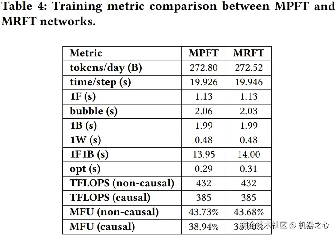 DeepSeek 还对 MPFT 和 MRFT 进行了对比性的性能分析,结果见图 5 和 6 以及表 4。