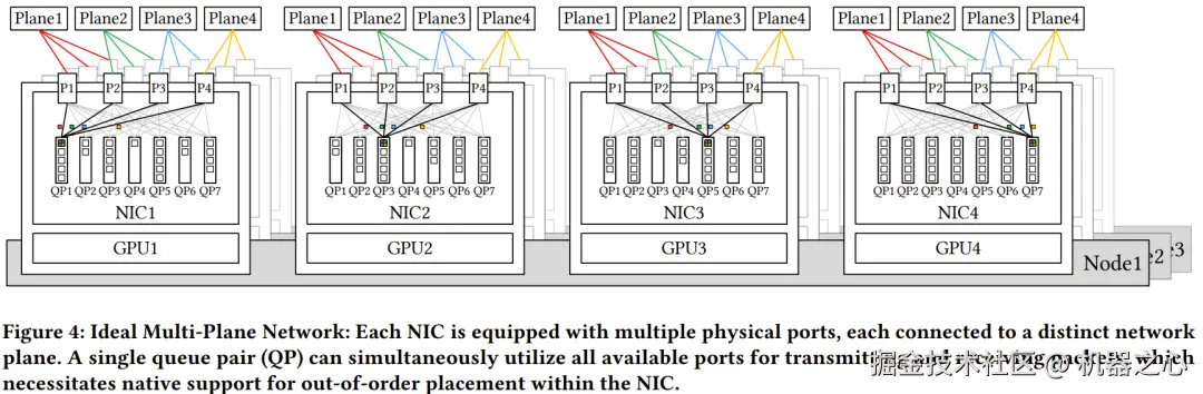 从用户的角度来看,单个队列对 (QP) 可以在所有可用端口之间无缝地发送和接收消息,类似于数据包喷射。因此,来自同一 QP 的数据包可能会穿越不同的网络路径,并以无序方式到达接收方,因此需要在网卡内原生支持无序布局,以保证消息一致性并保留正确的排序语义。例如,InfiniBand ConnectX-8 原生支持四平面。未来的网卡能够完全支持高级多平面功能,从而使双层胖树网络能够有效地扩展到更大的 AI 集群,这将大有裨益。总体而言,多平面架构在故障隔离、稳健性、负载均衡和大规模系统可扩展性方面具有显著优势。
