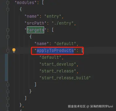- 在第一步配置完 product 后,还需在 modules 中的 applyToProducts 字段添加刚才配置的 product 产物,项目中创建的其他 hsp 也需一同配置,不然编译报错。