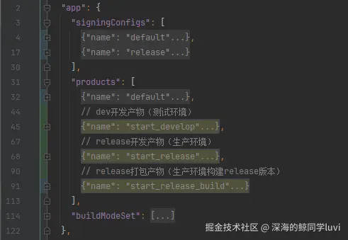 上方 JSON 中配置了 3 个产物与 2 个签名,3 个产物分别为 develop 开发环境产物, release 生产环境产物,release 生产环境构建产物。其中生产构建产物绑定了 "release" 签名,这样做的好处是,当我们切换环境选项时,签名相关配置也将一同被改变,无需手动更换签名。