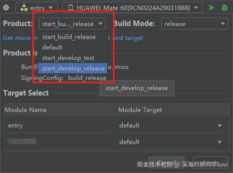 在鸿蒙应用开发中,一个应用可定义多个 product,每一个 product 对应一个定制的 APP 包,每个 product 中支持对 bundleName、bundleType、输出产物名称、icon 和 label 以及包含的 target 资源文件等内容进行定制。与此同时,也可以将环境配置和签名信息通过 product 进行隔离,通过选项切换环境进行构建,避免频繁的手动修改关键参数而造成打包遗漏的情况。
