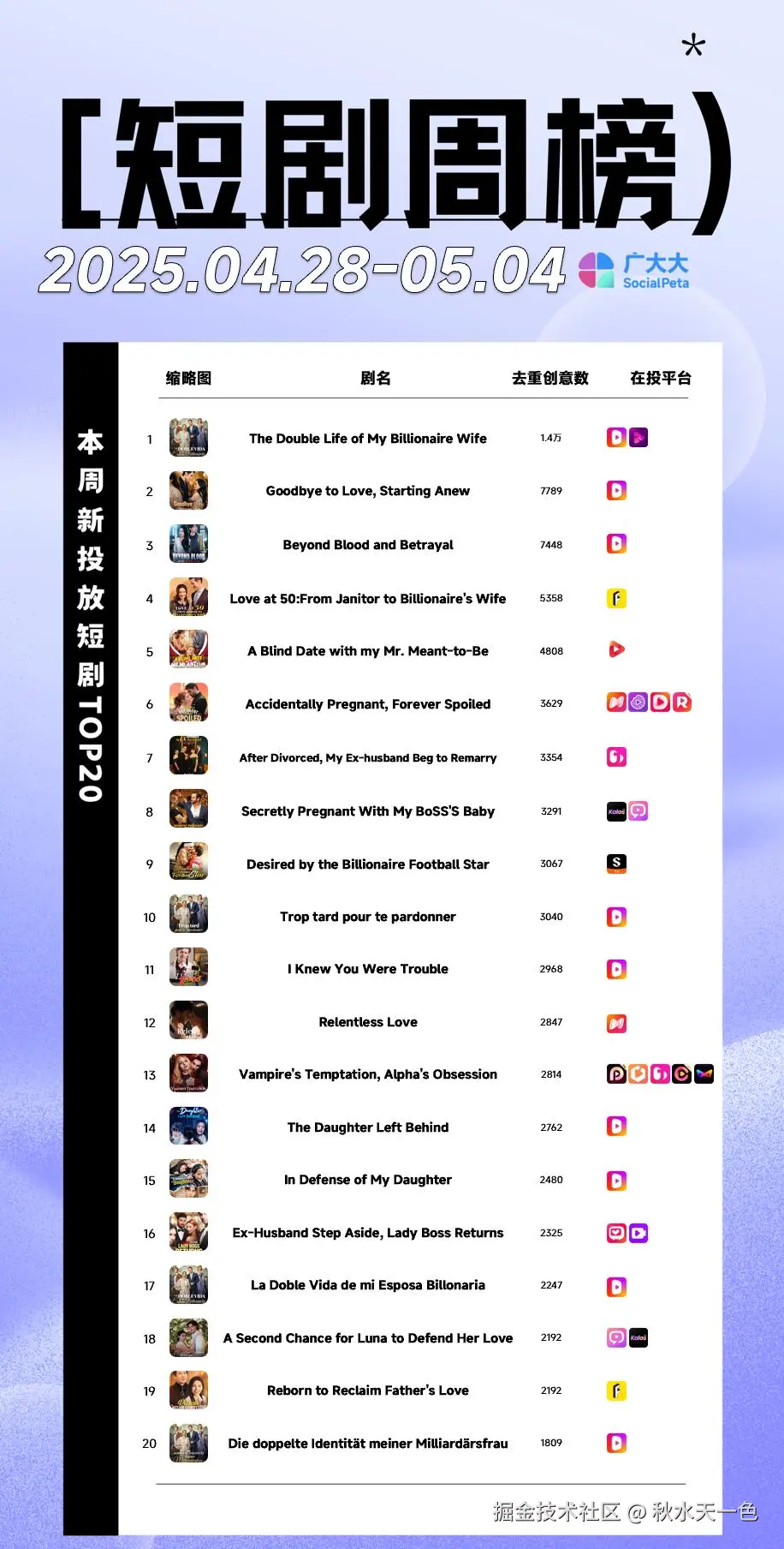 最后,是我们根据 广大大-短剧-剧目榜 数据整理出来的短剧周榜,欢迎大家自行查看。