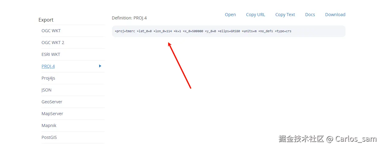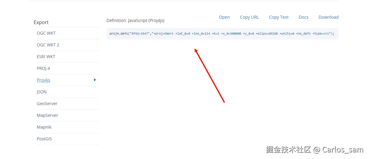 在详情页面中拖动到最下面就可以查看到 proj4字符串或者proj4.defs的代码: