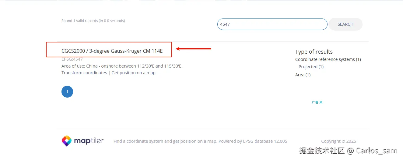 查找到坐标系统后,点击查看详情。(根据介绍可以看到 EPSG: 4547是一个投影坐标系统,它的大地基准是 CGCS2000,使用的投影是以东经114°经线为中央经线的 3°带高斯克吕格投影)