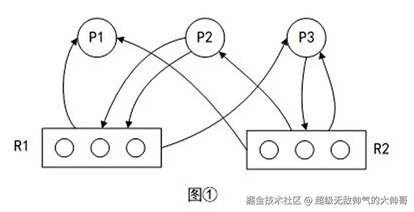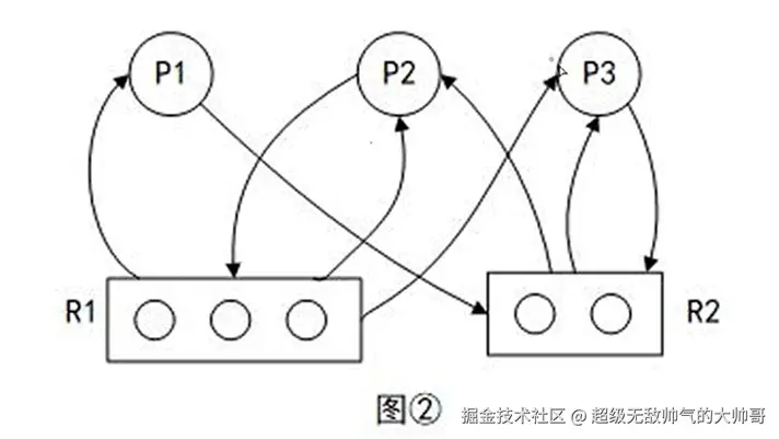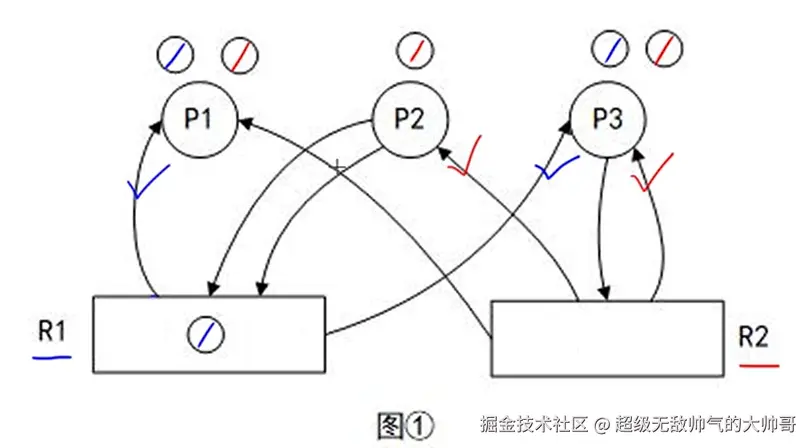 分配资源:R1 -> P1 申请资源:P2 -> R1