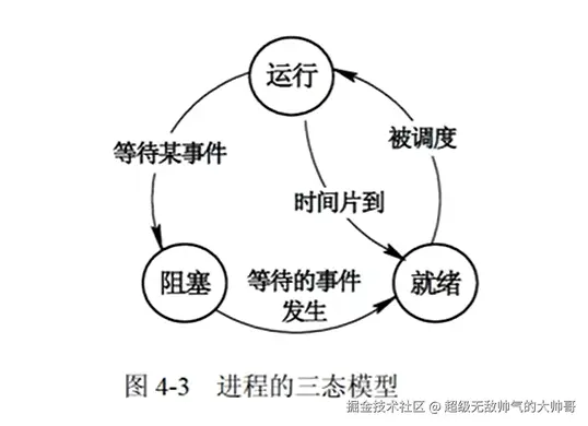 - 就绪:一个进程获取了处处理机外的一切所需资源,一旦获取到处理机即可运行,则此状态处于就绪状态;