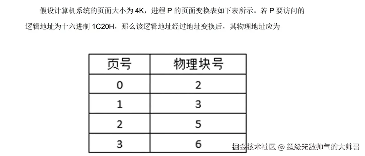 解题思路:物理地址为分页地址,由十六位二进制组成,页面大小为4K,即页内地址占位12位,剩余4位为页号,题中要访问1C20H,可以得到页号为1H,业内地址为C20H,即对应物理块号为3,最后物理地址为3C20H
