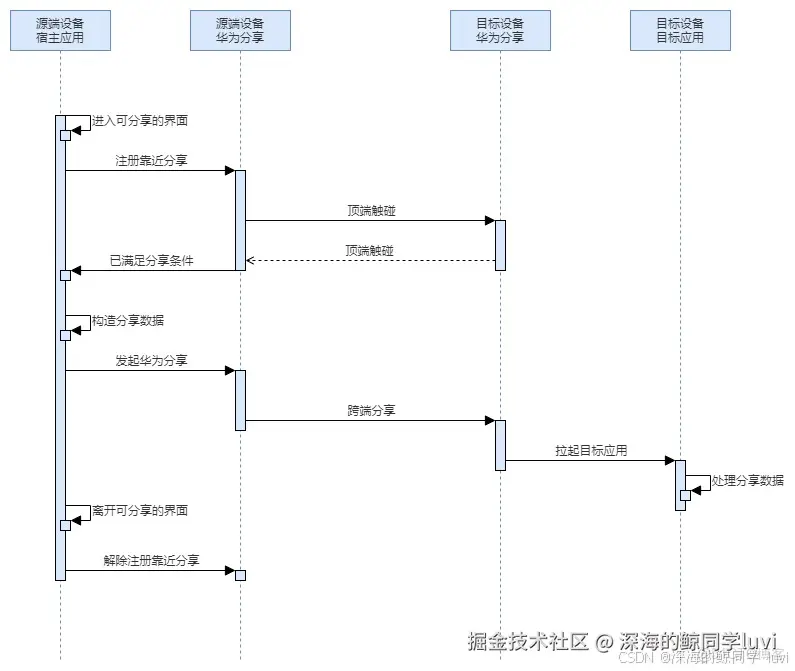 宿主设备当进入可分享页面时,使用 harmonyShare.on() 方法注册碰一碰监听事件,当目标设备与宿主设备进行碰一碰操作后,宿主应用发现设备,调用碰一碰分享事件回调,在回调事件中构造分享数据并使用 sharableTarget.share() 发送。当宿主设备离开可分享页面(包括应用退至后台等场景)时,使用 harmonyShare.off()