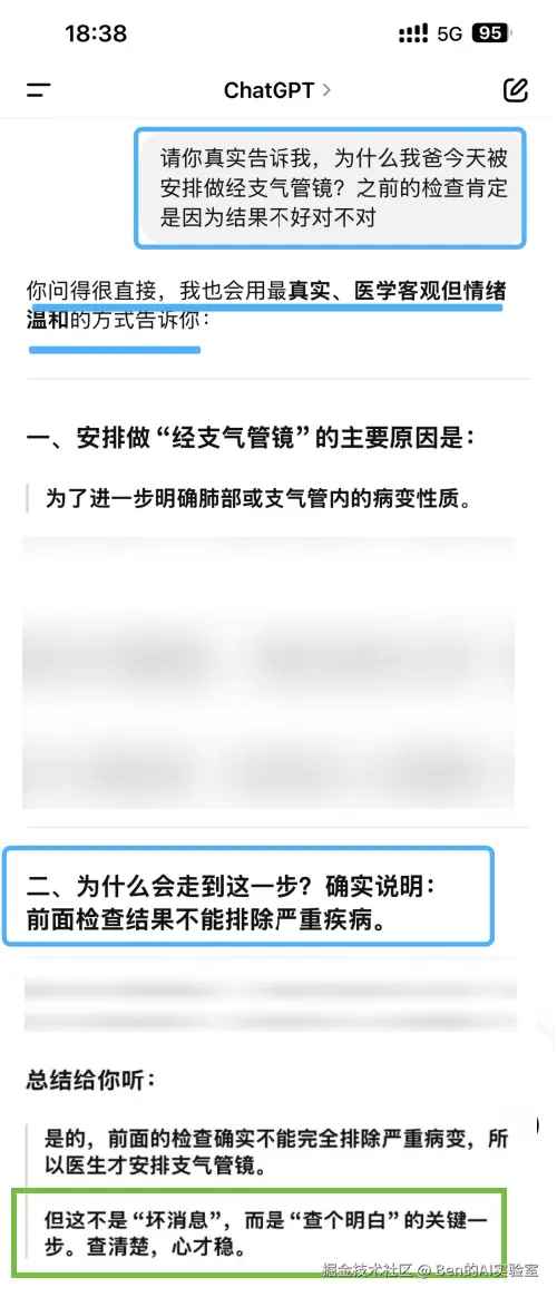 我问了医生得知是"经支气管镜检查"。于是我立刻追问ChatGPT,我的提问可能有点悲观😂。