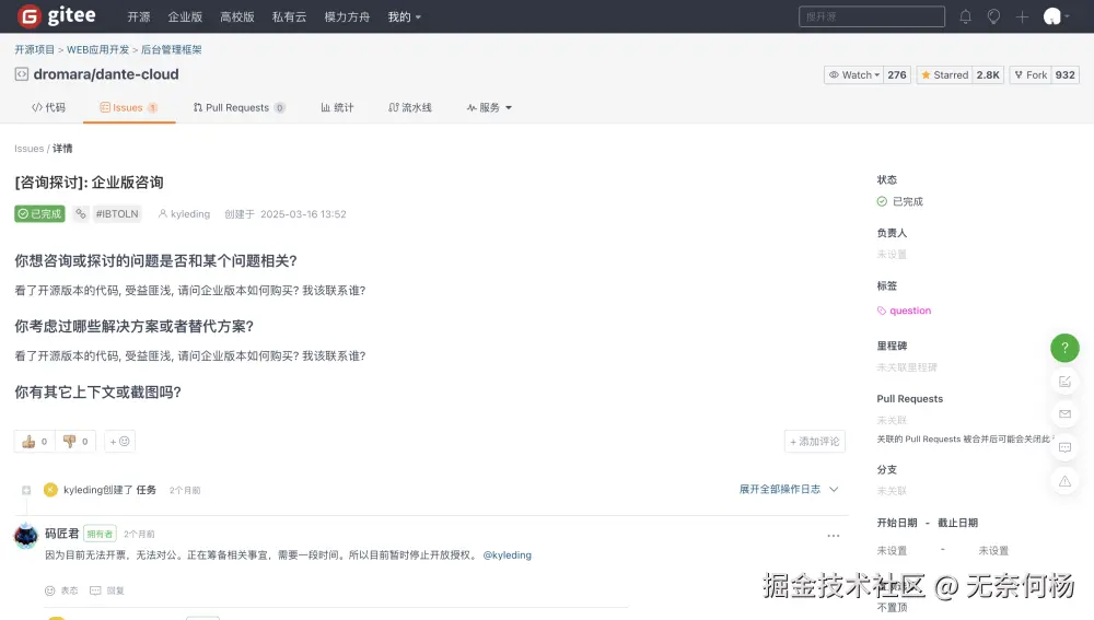 这里挺有意思的“企业版不面向个人,因为无法保证其真实用途。开源版本都如下图所示,企业版就更不得而知。”