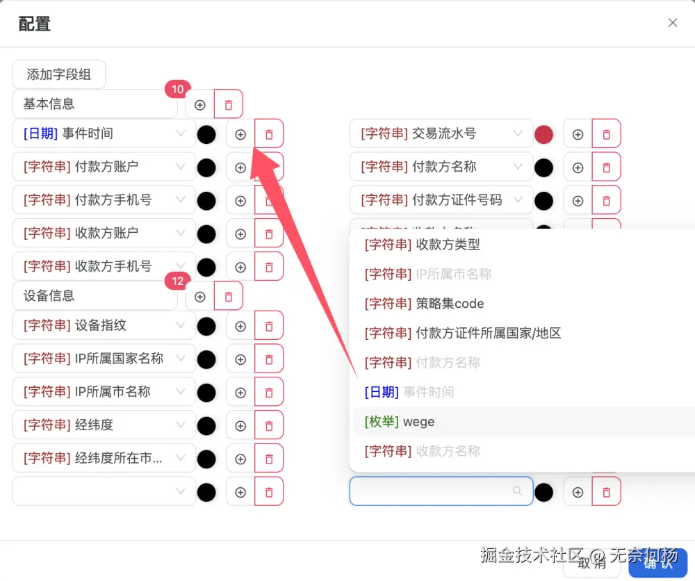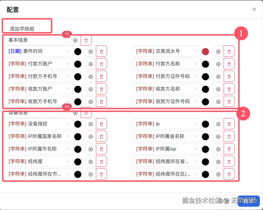 点击“设置”按钮可以配置字段如何展示,其结构如下,头部一个添加字段组按钮,其下就是具体的字段组配置(如图中1、2),可以选择字段和颜色;字段中添加新的字段可以通过字段组的+或字段的+,字段组的删除是删除整个字段组,字段的删除是删除这个字段的配置,字段组角标数即其下的字段数。