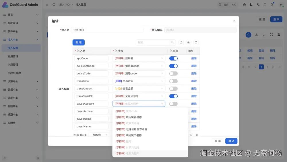 配置是存在哪里的呢?其实本来我是想再创建一张表的,专门用来存储用户个性化配置,包含一些习惯:系统主题、事件表格表头、导出字段列表等等,创建一个用户、类型、具体配置的表,就是我们常见的设置(setting),其实最终一般都是一段json, 但是临时还没有做了那么多,所以暂时使用了系统中已经有的参数配置,全局唯一不区分用户。如下,就是参数里配置的,只是临时方案。